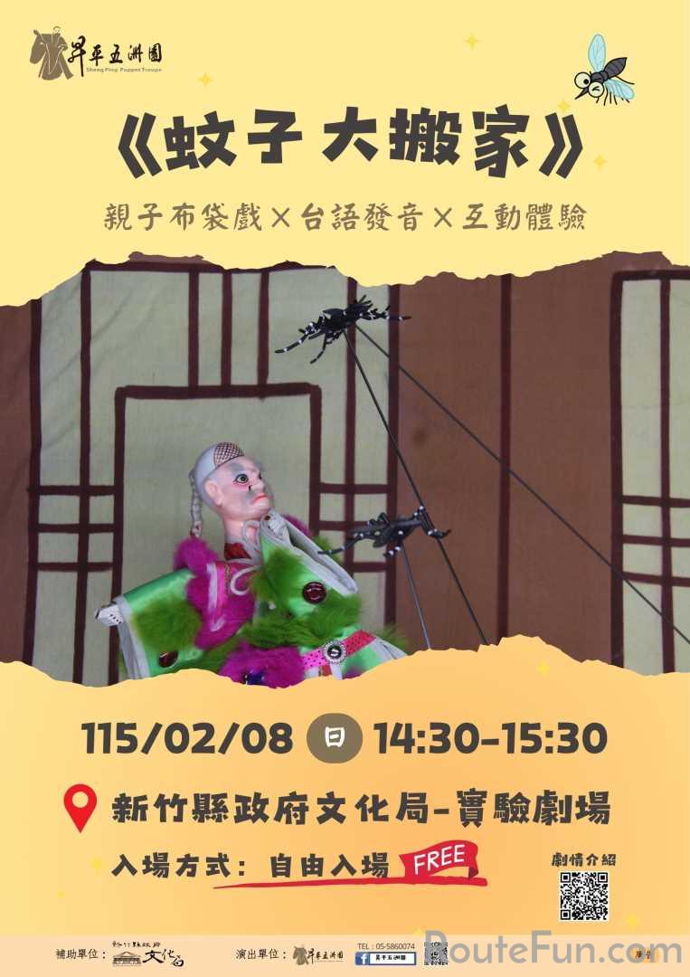 《蚊子大搬家》以阿土伯因儲水不當,引來大批蚊子為主軸,發展出一場逗趣的人蚊大戰。劇情以輕鬆詼諧的方式,引導觀眾思考「防蚊防疫」與「整潔生活」的觀念,進而內化為實際行動。演出結束後開放民眾體驗操偶。自由入場